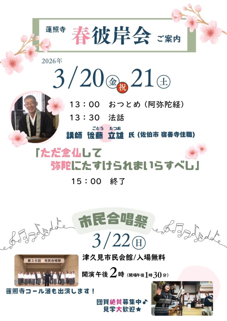 続きを読む1、住職お礼の挨拶2、浦川亮子先生挨拶・佐藤江津子先生挨拶3、花束贈呈4、食事をしながら懇親5、みんなで歌おう み仏のほほえみに・のんのさま・サライ・他